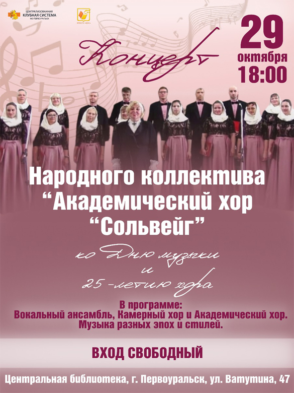 29 октября 2025 года в 18:00 в Центральной библиотеке (ул. Ватутина 47) состоится концерт народного коллектива «Академический хор «Сольвейг», приуроченный ко Дню музыки и 25-летию хора.